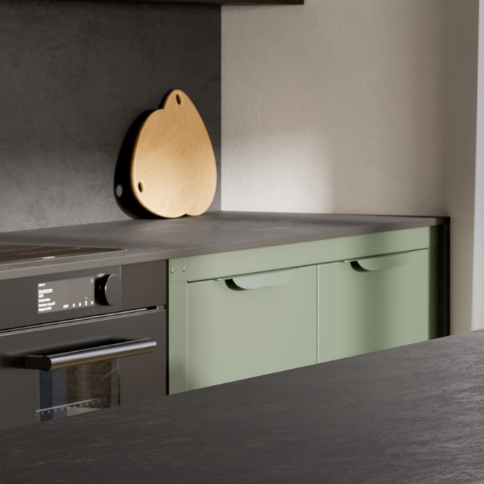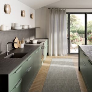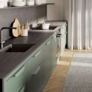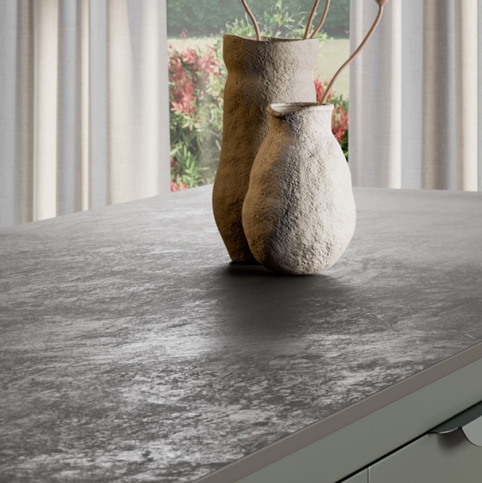 Aria Graphite Monolith is a compact laminate that looks, feels and sounds like stone but doesn’t need to be templated, allowing for easy installation. Ariaยฎย gives you the scope to create the kitchen youโve always dreamed of. Aria Graphite Monolith is manufactured as a single slab, the solid construction is waterproof and gives consistent colour throughout. Aria provides the same aspirational, clean, visual appeal of natural or engineered stone; but without the associated expense or complexity of installation.