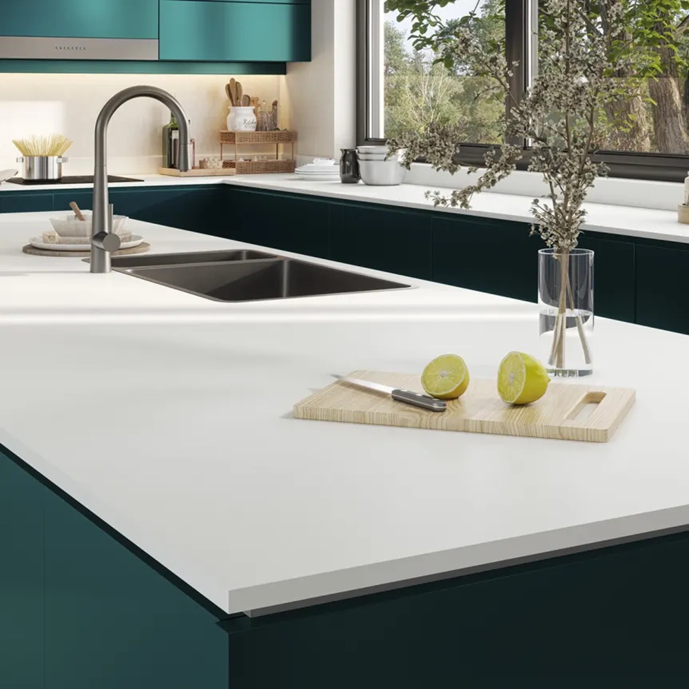 Create a glossier look by polishing this solid all the way through worktop โ€“ the more you polish, the greater lustre youโ€™ll achieve from Artic White Solid Surface Worktop. Need the kit to polish & install your solid surface worktops? Order our Solid Surface Worktop Installation Kit from us today and save on delivery when you order with a worktop.